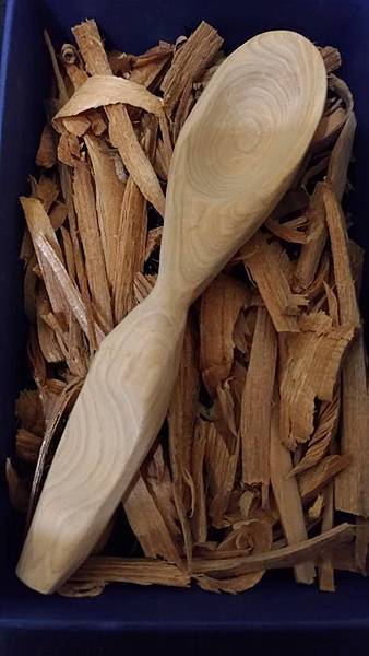 找了一個藍盒子,在底部鋪上香味撲鼻的檜木屑,再放入檜木茶匙,最後寫了「木」字貼在盒上。