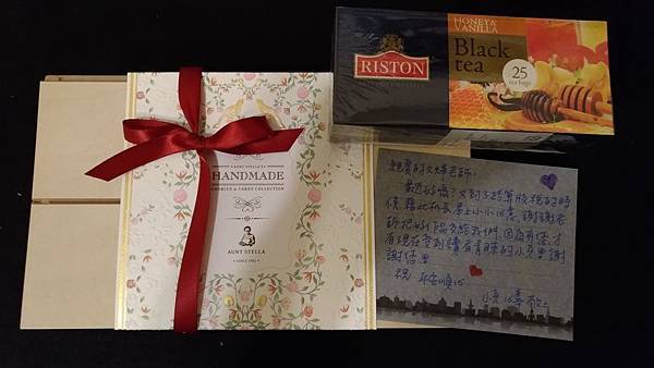 下午收到小兵出版社寄來的郵局包裹,以為裡頭是書,打開一看竟是Aunt Stella的手工餅乾禮盒、紅茶包、版稅明細和手寫問候卡片。